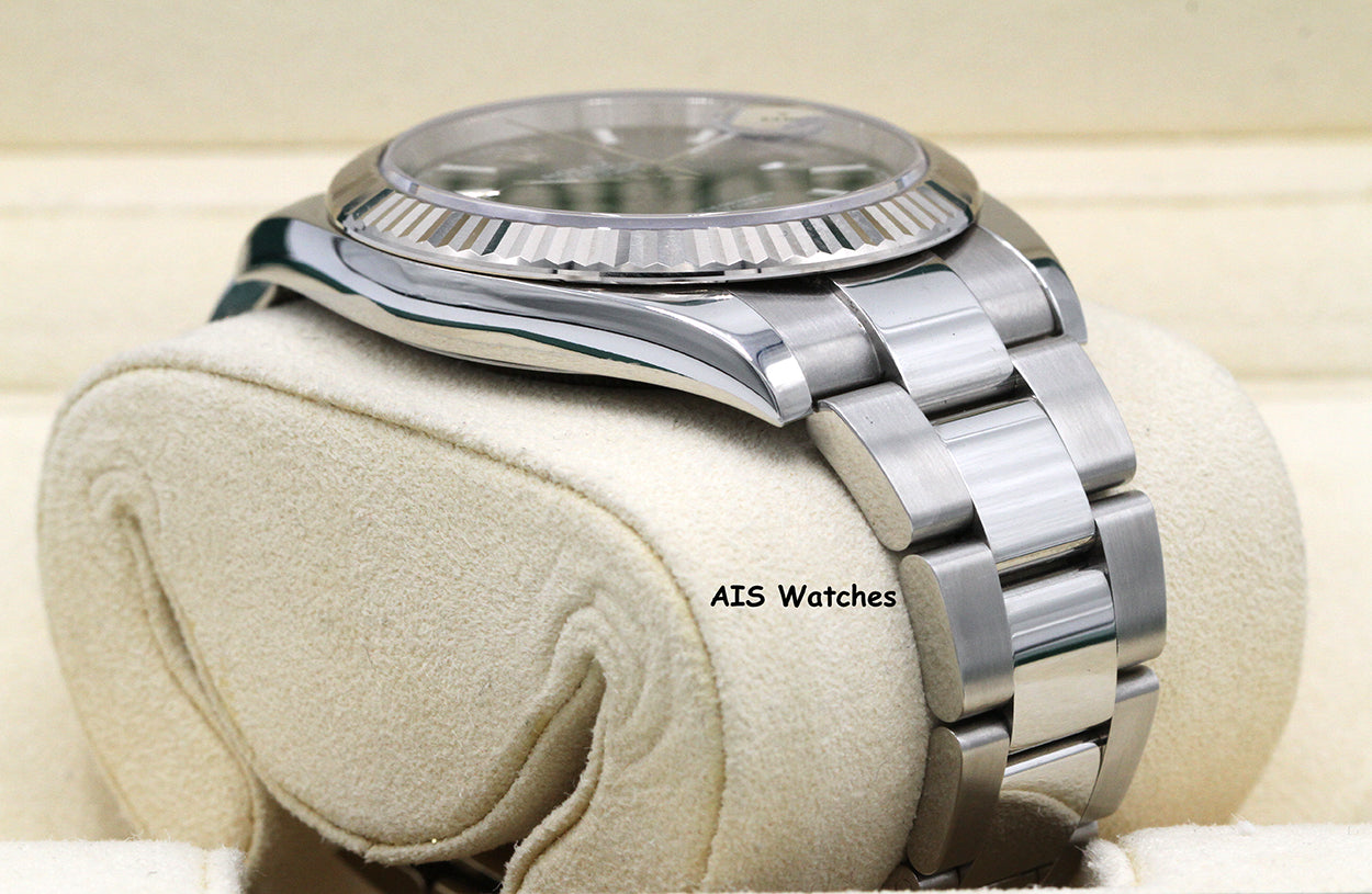 Up for sale is this Classic Rolex Datejust 41MM 126334 Black Stick Dial Oyster with 18K WG Fluted Bezel Box & Papers. The timepiece is in excellent condition.